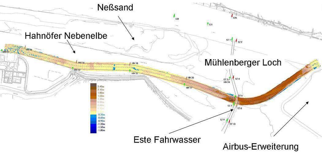 Monitoring results showed that several years later the planned compensation and development goals within the area ‘Hahnöfer Nebenelbe/Mühlenberger Loch’ such as conservation and establishment of shallow water areas, were only partly achieved, i.e. the channel silted up in its eastern end (see Fig. 2). Therefore further investigations by the Federal Waterways Engineering and Research Institute (BAW) were set up which should deliver a proposal for the optimization of the function of the channel. The results of the hydrodynamic modeling did not lead to any good solution i.e. to regain the missing 18 ha shallow water area. Furthermore a stable morphological state without any additional dredging could not be achieved.