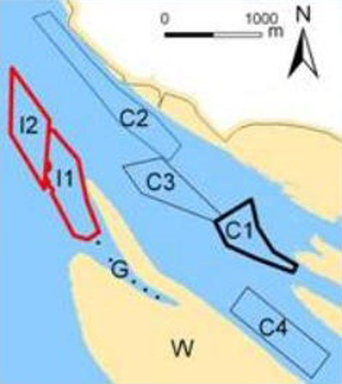 ecological criteria were related to the elevation of the Walsoorden sandbar, change in percentage intertidal mud and change in intertidal macrobenthos. The ecological monitoring consisted of an intertidal (Walsoorden sandbar) and subtidal part (shallow water around the Walsoorden sandbar, i.e. impact area Figure 4: I1). To analyse significant changes, a number of control areas were defined (Figure 4: C1-4). First the consistency of the soil (grain size and mud-percentage) was determined for the different areas in different seasons. Samples were also taken to analyse macrobenthos (biomass, diversity and density). At three locations, the elevation was observed in detail. To observe the developments of the Walsoorden sandbar as a whole, a flight was executed while using remote sensing and hyperspectral analysis. The goal of this extensive ecological monitoring program was to see whether the in situ relocation test caused a significant effect on all measured parameters, thus affecting the local ecology.