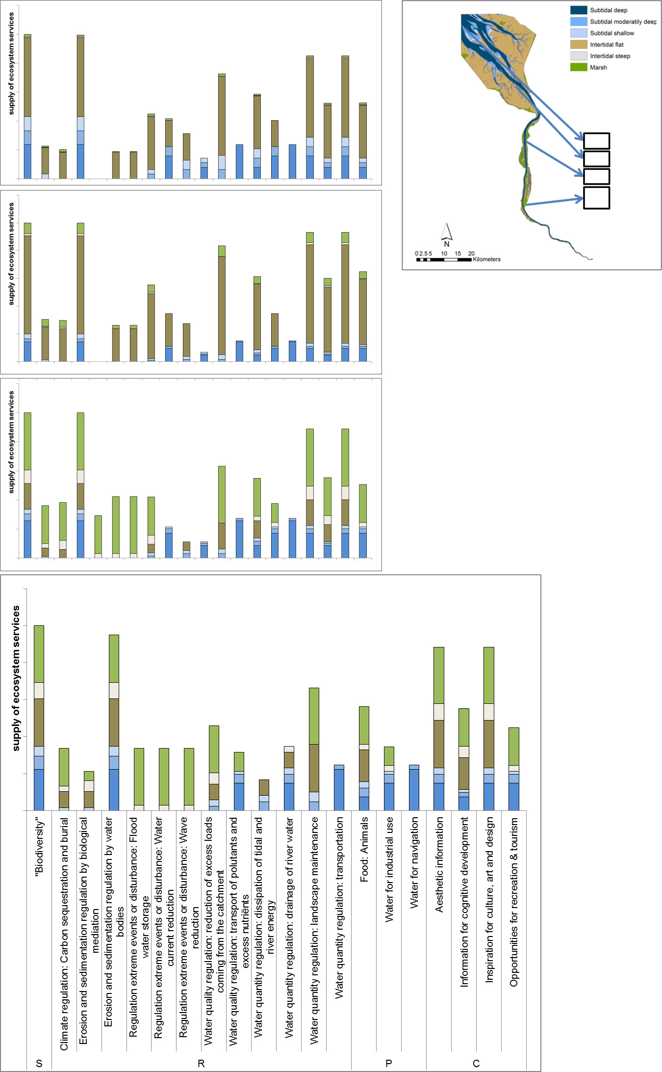 Provisioning services, such as water for industrial use and water for navigation, are mainly supplied in fresh and oligohaline zone, as the port activities are located in the more upstream area. Supporting services are mainly provided by intertidal flats and marshes, while subtidal habitats are more important for provisioning and water quantity regulating services.